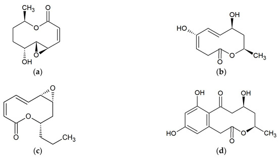 Chemical structures of 10-membered macrolides: (a) Curvulide A [19]; (b); Modiolide A [27]; (c) Phomolide A [28,29]; (d) Xestodecalactone B [33].
