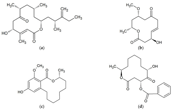 Chemical structures of 15- and 16-membered macrolides: (a) Butremycin [49]; (b) Bromophycolide P [50]; (c) Chalcomycin B [51]; (d) Neurymenolide A [53,54].
