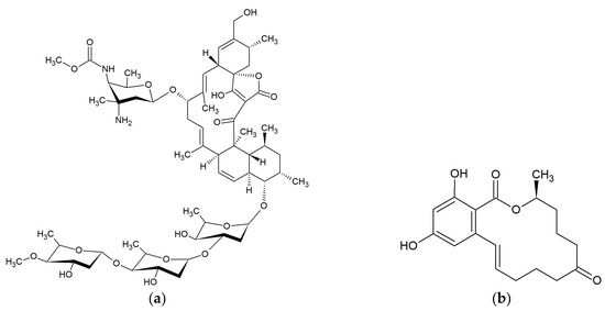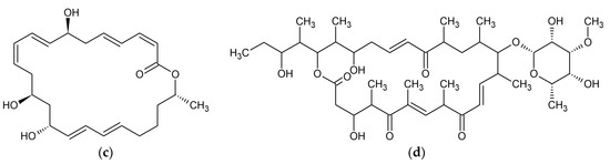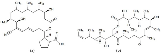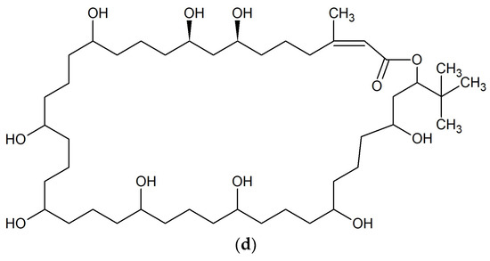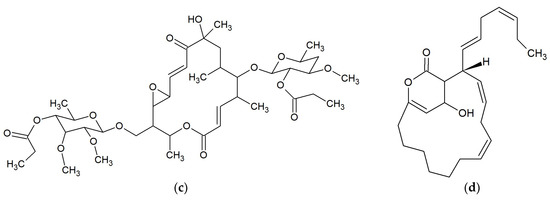 Macrolactins are a big group of 22- to 25-membered lactone macrolides. Some of these were isolated from a culture of Bacillus sp. PP19-H3 obtained from the macroalga Schizymenia dubyi collected on the Omaezaki coast of Shizuoka prefecture in Japan. Macrolactins A (Figure 8c), F, G, I, J, K, and L are 24-membered macrolides, macrolactin H is 22-membered, and macrolactin is M a 25-membered lactone. Macrolactins A, G, H, I, J, L, and M were effective against Staphylococcus aureus (MICs 5–10 ppm), and Bacillus subtilis (MICs 30–60 ppm). The macrolactins F and K had low activity against the above bacteria (MICs 80 and >100). None of the studied macrolides inhibited Escherichia coli or Salinivibrio costicola [77,78]. In other studies, macrolactin A did not have any antimicrobial activity [79,80].