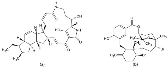 15- and 16-membered bromophycolides J-Q were isolated from extracts of the red alga Callophycus serratus from Yanuca, Fiji. Bromophycolides P (Figure 4b) and Q exhibited antibacterial activity against methicillin-resistant Staphylococcus aureus (MRSA) with an IC50 of 1.4 and 1.8 µM, respectively, and vancomycin-resistant Enterococcus faecium (VRE) with an IC50 of 13 and 5.8 µM, respectively [49].