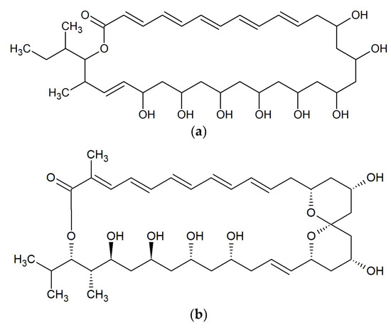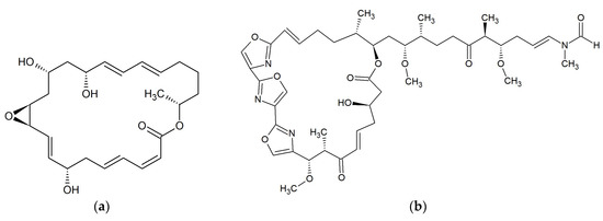 Ishibashi et al. demonstrated that scytophycins A–E isolated from terrestrial blue-green alga Scytonema pseudohofmanni collected from Oahu, Hawaii, exhibited cytotoxicity and antifungal activity [66]. Scytophycin B, scytophycin E, 6-hydroxyscytophycin B, and tolytoxin (Figure 7b) (6-hydroxy-7-O-methylscytophycin B) obtained from the terrestrial blue-green alga Cylindrospermum muscicola, isolated on the island of Kauai, Hawaii also had antifungal activity [67]. Tolytoxin and two analogs; 6-hydroxyscytophycin B and 19-O-demethylscytophycin C were also produced by strains of Scytonema mirabile, S. burmanicum, and S. ocellatum. These macrolides had antifungal activity against Aspergillus oryzae, Candida albicans, Penicillium notatum, and Saccharomyces cerevisiae [68]. Tolytoxin isolated from blue-green alga Tolypothrix conglutinata var. colorata found at Fanning Island, Kiribati, exhibited additional inhibitory activity against Alternaria alternata, Bipolaris incurvata, Calonectria critalarae, Colletotrichum coccodes, Phyllosticta capitalensis, Phytophthora nicotianae, Rhizoctonia solani, Sclerotium rofsii, Thielaviopsis paradoxa, and Trichophyton mentagrophytes with MICs of 0.25–8 nM. Tolytoxin did not show any inhibitory activity against bacteria [69]. The presence of scytophycins with activity against Candida albicans and Aspergillus flavus has also been demonstrated in cyanobacteria Anabaena sp. HAN21/1, Anabaena cf. cylindrica PH133, Scytonema sp. HAN3/2, and Nostoc sp. HAN11/1 [70].