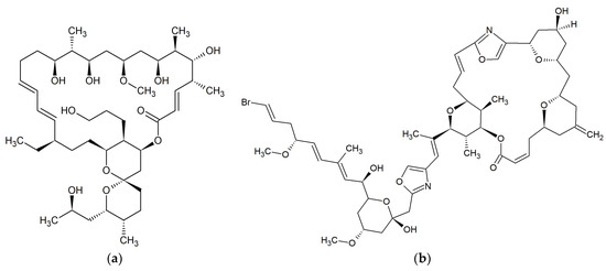 Chemical structures of 20-membered macrolides: (a) 15G256ι [61]; (b) Misakinolide A [62,63].