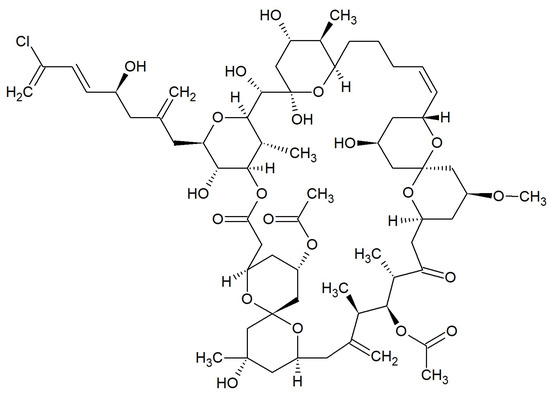 Recently, the increasing resistance of bacteria to antibiotics has become a serious problem. Globally, about 700,000 deaths every year may be caused by microorganisms resistant to antimicrobials [13]. In epidemiology, the most significant are the multidrug-resistant bacteria, e.g., Escherichia coli, Klebsiella pneumoniae, Acinetobacter baumanii, methicillin-resistant Staphylococcus aureus (MRSA), vancomycin-resistant MRSA, penicillin-resistant Streptococcus pneumoniae (PRSP), vancomycin-resistant Enterococcus (VRE), and extensively drug-resistant (XDR) Mycobacterium tuberculosis [14]. Antimicrobial resistance is increasingly common among both human and animal pathogens [10,15,16,17]. Antimicrobial resistance related to food containing zoonotic and fecal bacteria (Salmonella sp., Campylobacter sp., Escherichia coli and Enterococcus sp.) is also gaining importance [18]. The hope is to find new antibiotics to fight against multidrug-resistant strains. The source of these drugs could be marine macrolides.