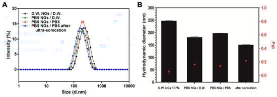 Size distribution of fabricated nanogels (NGs). (A) Intensity size distribution by dynamic light scattering (DLS) analysis; (B) average hydrodynamic diameter of D.W.-NGs/D.W., PBS-NGs/D.W., PBS-NGs/PBS, and PBS-NGs/PBS after ultra-sonication.