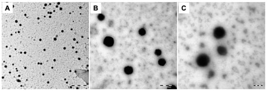 Morphology. Transmission electron microscopy (TEM) images of gelatin methacryloyl nanogels (GelMA NGs). (A) Scale bar = 1 μm; (B) scale bar = 200 nm; (C) scale bar = 100 nm.