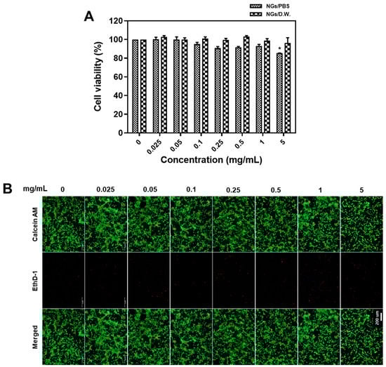 The cell was seeded at the density of 1 × 104 cells/well and cultured for 24 h (96-well plate). Afterwards, NGs were added at various concentrations (0, 0.025, 0.05, 0.1, 0.25, 0.5, 1, and 5 mg/mL) and incubated for one day. Then, 3(4,5-Dimethylthiazol-2-yl)-2,5-diphenyltetrazolium bromide (MTT, Duchefa, Haarlem, The Netherlands) reagent was added with fresh DMEM. After incubation for 2 h, the cells were lysed using 100 μL of dimethyl sulfoxide (DMSO). The absorbance was measured at a wavelength of 570 nm using a microplate spectrophotometer. Cell viability was calculated using the following equation.