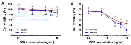 Cytotoxicity test. Cell viabilities of NIH3T3 cells treated with DOX-GelMA NGs and free DOX for (A) 4 h and (B) 24 h. Data are presented as the average ± standard deviation (n = 9). Cell viability with different letters (a–c) show significant differences depending on DOX concentrations (p < 0.05).