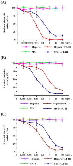 Effects of MS-1 on thrombin and factor Xa activities. (A) The activity of thrombin in the absence and presence of AT-III; (B) the activity of thrombin in the absence and presence of HC-II; and (C) the activity of factor Xa in the absence and presence of HC-II.