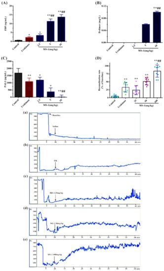Results of fibrinolytic and thrombolytic activities in vivo of MS-1. (A) FDP; (B) d-dimer, the d-dimer value of control and urokinase was below 0.05 mg/L; (C) PAI-1; and (D) recanalization rate, time–carotid artery blood flow curves of mice injected saline (a: saline; b: urokinase; c: 25 mg/kg MS-1; d: 50 mg/kg MS-1; d: 100 mg/kg MS-1). Significance: * p < 0.05, ** p < 0.01 versus the control group; # p < 0.05, ## p < 0.01 versus the urokinase group.