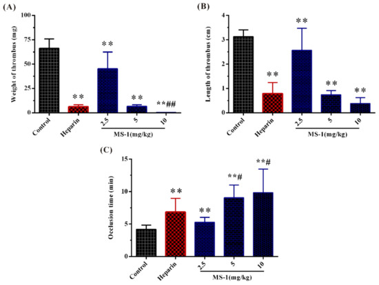 Antithrombotic effect of MS-1. (A) Thrombus dry weight, (B) thrombus wet length, and (C) occlusion time. Significance: * p < 0.05, ** p < 0.01 versus the control group; # p < 0.05, ## p < 0.01 versus the heparin group.