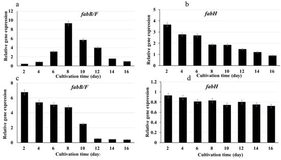 As shown in Figure 1a, the expression level of fabB/F was relatively low in the early growth stage (2 days–6 days), and reached the highest expression level at day 8, then decreased in the later period of culture time (10 days–16 days). The overall trend of expression level of fabB/F increased first and then decreased, which was consistent with the variations of fatty acid composition (Table 1), that is to say, the SCFAs mainly accumulated in early growth stage. The result indicated that fabB/F played an important role on the synthesis of SCFAs. On the other side, during the whole cultivation phase, the expression level of fabH was not high enough, and showed a trend of gradual decrease, only with relatively high expression level in the early growth stage (2 days–6 days) (Figure 1b). Inhibition of the expression of fabB/F will hinder the transformation of SCFAs (C12, C14) to relatively longer chain fatty acids (C16, C18), leading to SCFAs accumulation, which also verified the previous hypothesis that fabB/F is a key gene promoting the synthesis of SCFAs (C12, C14) to longer chain fatty acids (C16, C18).