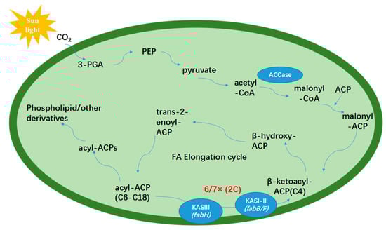 Microalgae, as a high-quality oleaginous aquatic microorganism, are primarily used for biodiesel, polyunsaturated fatty acids and pigments, but rarely for SCFAs. The content of SCFAs in microalgae was not high under normal growth conditions [16,17,18,19,20,21]. Some microalgae can accumulate SCFAs when cultivated in stressed conditions [22], but the related mechanism of this is unclear. Studies on the synthesis mechanisms of SCFAs are mostly conducted in plants and bacteria [4], and mainly focused on the key enzymes such as thioesterases (TEs) and β-ketoacyl ACP (Acyl Carrier Protein) synthases (KAS). TEs are mainly present in plants and some eukaryotic microalgae, associated with the termination of the fatty acid synthesis cycle by catalyzing ACPs to remove from acyl-ACPs, producing free fatty acids [23,24]. Past efforts to increase medium chain fatty acid (MCFA) production in microalgae by genetic modifications of chain-length specific TEs have met with limited success, because of high specifics and substrate preferences of TEs. β-ketoacyl ACP synthases are associated with the carbon chain elongation of fatty acids, which are classified as KAS I, KAS II and KAS III, encoded by fabB, fabF and fabH, respectively [25,26]. It is reported that KAS III could catalyze the combination of acetyl-CoA with malonyl-CoA to generate 4:0-ACP, KAS I could catalyze 4:0-ACP to generate 16:0-ACP and KAS II could catalyze 16:0-ACP to generate 18:0-ACP as well as control the ratio of 16:0-ACP/18:0-ACP [27]. Verwoert et al. [28] overexpressed the KAS III gene from E. coli in rapeseed, causing changes in fatty acid composition, which decreased the content of C18:1 and increased the content of C18:2 and C18:3. Dehesh et al. [29] overexpressed the KAS III gene from spinach in three kinds of plants (Tobacco, Arabidopsis thaliana, Rape), leading to C16:0 fatty acid accumulation. Research on cyanobacteria Synechococcus sp. PCC 7002 revealed that KAS III initialized the synthesis of fatty acids circle, causing the condensation of malonyl ACP and acetyl CoA to form acetyl–acetyl ACP, which was thought of the only rate-limiting step in fatty acid synthesis of cyanobacteria [30]. The result is different from that of E. coli, where KAS III was not rate-limiting.