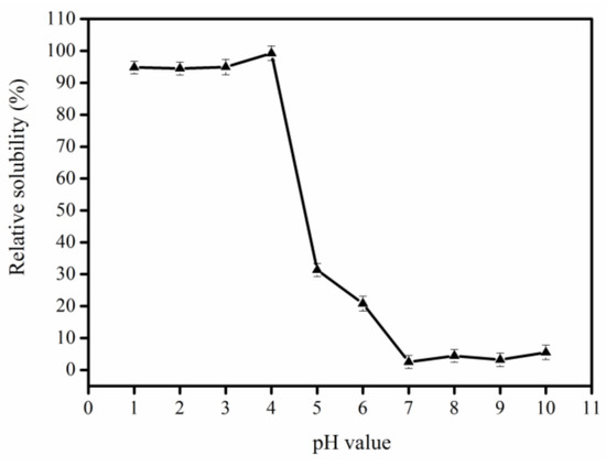 The determination of the collagen isoelectric point is necessary for using isoelectric precipitation to recover and purify collagen. As shown in Figure 1, pepsin-solubilized collagen (PSC) from bigeye tuna skin had the best solubility in the range of acidic pH values (≤4.0) and had lower solubility in the range of neutral or alkaline pH values. Similarity, the PSC from Nibea japonica skin and the PSC from silver carp showed the maximum solubility in the pH range of 1.0–4.0, and lower solubility in the neutral or slightly alkaline pH range [9,25]. Our result was consistent with these studies. When the pH value is above or below the isoelectric point of a protein, the net charge, repulsive forces, and interaction capacity with water, increase. However, if the protein has no net charge at the isoelectric point, the protein will aggregate and precipitate due to hydrophobic–hydrophobic interactions. In the present study, PSC showed the lowest solubility at pH 7.0, therefore, this value was selected for collagen extraction from bigeye tuna skin.