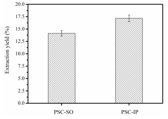 The PSC from the bigeye tuna skin was precipitated using the salting-out method (PSC-SO) and isoelectric precipitation method (PSC-IP) separately. The yield of PSC-SO and PSC-IP was 14.14% (dry weight) and 17.17% (dry weight), respectively (Figure 2). Due to the high concentration of NaCl (1.5 M) in PSC-CO, it took four days of dialysis after salting-out to ensure that PSC-SO was not affected by NaCl and acetic acid. In addition, large amounts of wastewater were produced due to the use of high salt concentrations. Our results were consistent with previous studies that demonstrated the use of NaCl (0.5–1.5 M) to precipitate collagen [3,15]. Due to the low salt concentration required for PSC-IP, dialysis only took two days after the process and less waste water was produced than for PSC-SO. Since collagen yields were greater from PSC-IP, and a shorter time of dialysis was required than for PSC-SO, the PSC-IP method was selected for extracting PSC from bigeye tuna skin.