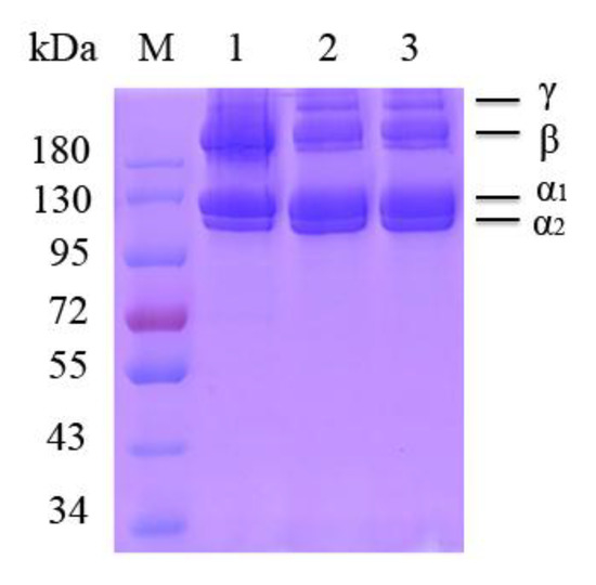 Sodium Dodecyl Sulfate-Polyacrylamide Gel Electrophoresis (SDS-PAGE) analysis of PSC-SO and PSC-PI product from bigeye tuna skin. M: Protein markers; Lane 1: Bovine collagen type I; lane 2: PSC-SO from bigeye tuna skin; lane 3: PSC-PI from bigeye tuna skin.