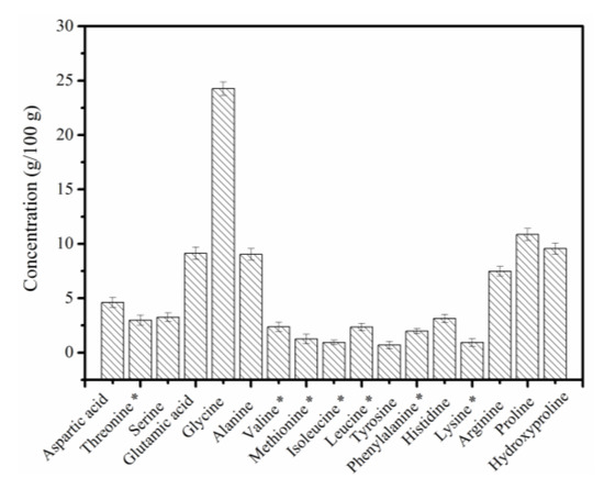 The amino acid contents of the PSC-IP product are shown in Figure 4. The major amino acid in the PSC-IP product is glycine, which constitutes approximately 24% of the total amino acid contents. Other amino acids that were in high proportions were proline (10.86%), hydroxyproline (9.56%), alanine (9.04%), glutamic acid (9.13%), and arginine (7.49%). Cysteine was not detected in the PSC-IP product from bigeye tuna skin. The amino acid contents in PSC-IP product were consistent with the collagen from bigeye tuna in the previous study (glycine (22.2–22.7%), proline (14.8–15.1%), alanine (9.7–9.9%), glutamic acid (9.8–9.9%), hydroxyproline (8.0–8.2%)) [26]. In addition, the high content of glycine, proline, and hydroxyproline in the PSC-IP product is consistent with the high frequency of occurrence of the glycine-proline-hydroxyproline sequence in collagen, which is essential for triple helical formation [4,5]. The content of amino acids (proline and hydroxyproline) in PSC-IP product is 20.42%, which was similar to jellyfish Acromitus hardenbergi collagen (19.50%) [2], crap scales or bones collagen (19.2%) [30].