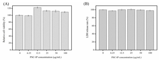 Relative cell viability (A) and lactate dehydrogenase (LDH) release (B) as affected by 24 h treatment of PSC-IP product (0, 6.25, 12.5, 25, 50, and 100 μg/mL) from bigeye tuna skin.