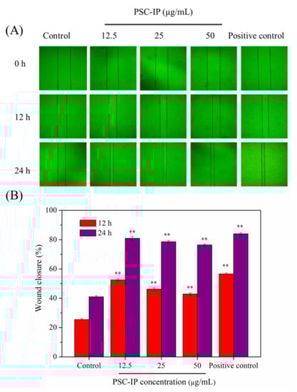 Effects of PSC-IP product from bigeye tuna skin on the scratch closure rate. (A) PSC-IP promoted cell migration was evaluated using a scratch wound healing assay. (B) Wound closure rate. * p < 0.05 and ** p < 0.001 vs. control.