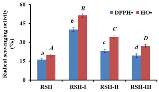 2,2-diphenyl-1-picrylhydrazyl radical (DPPH•) and hydroxyl radical (HO•) scavenging activity of protein hydrolysate (RSH) and its three fractions by ultrafiltration at the concentration of 10 mg protein/mL. All data were presented as mean ± standard deviation (SD, n = 3). a–d or A–D, Values with same letters indicated no significant difference of different samples on DPPH• or HO• scavenging activity (p > 0.05).