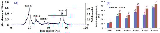 Figure 2A showed that four fractions (RSH-I-1 to RSH-I-4) were separated from RSH-I using a DEAE-52 cellulose column. Among them, RSH-I-1 was eluted using deionized water (DW); RSH-I-2 and RSH-I-3 were eluted using 0.1 M NaCl; and, RSH-I-4 was eluted using 0.5 M NaCl. Figure 2B indicated that the DPPH• and HO• scavenging activities of RSH-I-4 were 70.2 ± 1.8% and 82.4 ± 3.20% at the concentration of 10 mg protein/mL, which were significantly (p < 0.05) higher than those of RSH-I, RSH-I-1, RSH-I-2, and RSH-I-3 at the same concentration. Acidic and hydrophobic amino acid residues in peptides can be easily adsorbed to the anion exchange resins, and the interaction strength is closely related to the number and location of the charges on the molecule structure [25,30]. The results indicated that RSH-I-4 might contain some APs, with acidic and hydrophobic amino acid residues.