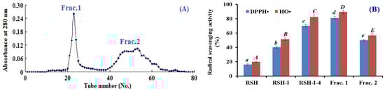 Elution profile of RSH-I-4 using Sephadex G-15 column (A) and DPPH• and OH• scavenging activities of subfractions (Frac.1 and Frac.2) from RSH-I-4 at the concentration of 10 mg protein/mL (B). All data were presented as mean ± SD (n = 3). a–e or A–E, Values with same letters indicated no significant difference of different samples on DPPH• and HO• scavenging activity (p > 0.05).