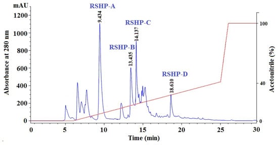 Finally, Frac.1 with high DPPH• and HO• scavenging activities was purified by RP-HPLC while using a linear gradient of acetonitrile (CAN) (Figure 4). All of the chromatographic peaks were collected on their chromatographic peaks and their purities were analyzed. Finally, four APs (RSHP-A, RSHP-B, RSHP-C, and RSHP-D) with retention times of 9.434, 13.435, 14.137, and 18.610 min. had high purities and met the requirement of sequence determination (Table 1). Therefore, RSHP-A, RSHP-B, RSHP-C, and RSHP-D were pooled and lyophilized, and their sequences and activities were determined in the following experiment.