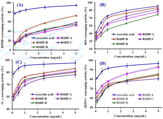 DPPH• (A), HO• (B), • (C), and ABTS+• (D) scavenging activities of RSHP-A, RSHP-B, RSHP-C, and RSHP-D from protein hydrolysate of red stingray (D. akajei) cartilages. All data are presented as mean ± SD (n = 3).