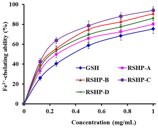 Fe2+-chelating ability of the four isolated APs (RSHP-A~D) from protein hydrolysate of red stingray (D. akajei) cartilages. All data are presented as mean ± SD (n = 3).