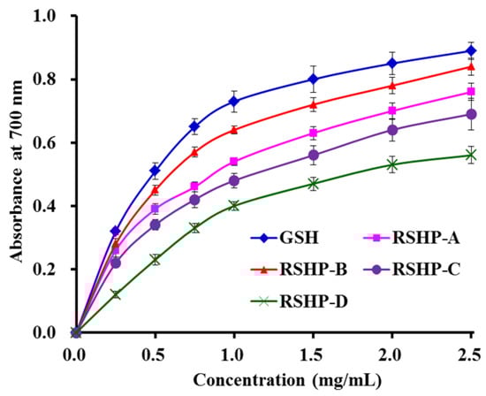 Reducing power of the four isolated APs (RSHP-A~D) from protein hydrolysate of red stingray (D. akajei) cartilages. All data are presented as mean ± SD (n = 3).