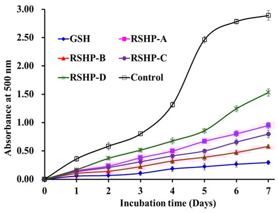 Lipid peroxidation is a complex process that involves the formation and propagation of lipid radicals and lipid hydroperoxides in the presence of oxygen [2]. Each assay, such as DPPH, hydroxyl, superoxide anion, and ABTS cation radical scavenging assays measured an antioxidant property that represents a different mechanism, which could not reflect the multiple mechanisms, by which the sample acted as an antioxidant to inhibit lipid oxidation in a food system and living organisms [51]. Therefore, the activities of RSHP-A, RSHP-B, RSHP-C, and RSHP-D against the peroxidation of linoleic acid were investigated and compared to that of the positive control (GSH) and negative control (without antioxidant) in this section (Figure 9). The inhibiting ability of RSHP-B was higher than those of RSHP-A, RSHP-C, and RSHP-D. However, the inhibiting ability of four isolated APs (RSHP-A~D) was lower than that of the positive control of GSH. The result of lipid peroxidation inhibition assay suggested that RSHP-B might inhibit the lipid peroxidation propagation cycle through reacting with peroxyl radicals. In addition, the activity of RSHP-B on lipid peroxidation inhibition slightly less than GSH can be compensable by increasing the dose.