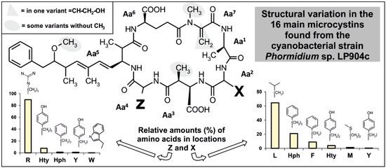 - Namikoshi, M.; Sivonen, K.; Evans, W.R.; Carmichael, W.W.; Rouhiainen, L.; Luukkainen, R.; Rinehart, K.L. Structures of three new homotyrosine-containing microcystins and a new homophenylalanine variant from Anabaena sp. strain 66. Chem. Res. Toxicol. 1992, 5, 661–666. [Google Scholar] [CrossRef]