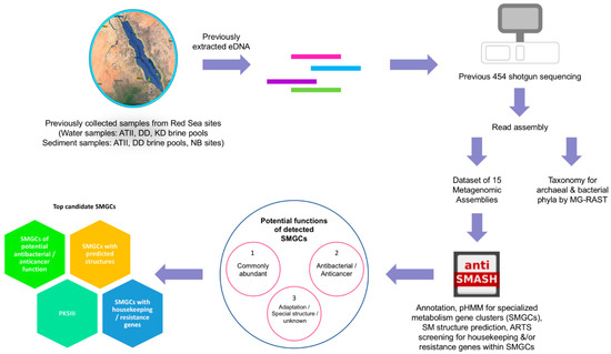 In this study we investigated specialized metabolism gene clusters in Red Sea brine water and sediment samples through metagenomic mining. Metagenomes from different sites in the Atlantis II, Discovery Deep and Kebrit Deep brine pools [28,36] were comprehensively studied to determine quantitatively and qualitatively SMGCs in the selected Red Sea brine prokaryotic metagenomes. Red Sea brine SMGCs’ homology to known biosynthetic gene clusters, predicted functions and structures of the encoded potential specialized metabolites are addressed, and their potential contribution in shaping the microbial communities in such harsh environments are discussed.