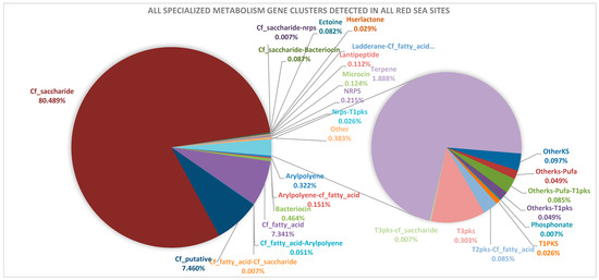 The most abundant SMGC class detected in the Red Sea samples coded for saccharides (80.49% of total SMGCs) (Figure 2). This is in concordance with the study of Cimermancic et al., wherein saccharides comprised the largest detected SMGC type (40% of total detected SMGCs) [46]. The second largest group of SMGCs was the cf_putative SMGCs (7.46% of the total SMGCs) (Table S2). Such putative gene clusters are unknown biosynthetic gene clusters, with no specific category assigned to them. It is likely that these novel gene clusters constitute a specific group of ‘SMGC dark matter’ [9], that we aimed to preliminarily categorize.