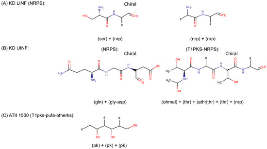 Promising Red Sea brine specialized metabolite candidates. Five core structures for specialized metabolites were predicted using antiSMASH 4.0 [45]: (A) KD brine–seawater Lower Interface (KD LINF) site had two non-ribosomal peptides predicted to be synthesized by two non-ribosomal peptide synthetase (NRPS) clusters. (B) KD brine–seawater Upper Interface (KD UINF) site had a non-ribosomal peptide predicted to be synthesized by a NRPS cluster and a hybrid polyketide-non-ribosomal peptide predicted to be synthesized by T1PKS-NRPS. (C) ATII 1500 site had a polyketide predicted to be produced by a T1pks-pufa-otherks hybrid cluster. Four top promising candidate SMGCs were detected by ARTS [38]: (D) ATII brine Lower Convective Layer (ATII LCL) site had two clusters encoding Terpene and T3PKS. (E) ATII 200 site had a cluster encoding aryl polyene. (F) ATII 1500 site had a cluster encoding Otherks-PUFA-T1PKS (PUFA: polyunsaturated fatty acid). ser: serine, nrp: non-ribosomal peptide, gln: glutamine, gly: glycine, asp: aspartate, thr: threonine, pk: polyketide, ohmal: hydroxy malate.