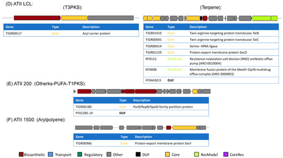 We classified the predicted Red Sea SMGCs according to the potential function of their products into three main groups: (1) products of predicted functions commonly abundant in microbes, including saccharides, fatty acids, aryl polyenes and acyl-homoserine lactones, (2) subset of products with potential antibacterial and/or anticancer effects, including terpenes, ribosomal peptides, non-ribosomal peptides, polyketides and phosphonates, and (3) miscellaneous products that are predicted to confer adaptation to the environment/special structure/unknown function, including polyunsaturated fatty acids, ectoine, ladderane and others (Table 3). When applicable, the product class representative chemical structures are also depicted in Table 3, e.g., ladderane structure. Additionally, five predicted core structures of the potential products coded by the SMGCs of the Red Sea dataset were computationally predicted (Figure 3). Two core structures were predicted in the KD LINF layer for non-ribosomal peptides, both coded for putative NRPS clusters (Figure 3A). A chiral non-ribosomal peptide structure was predicted in KD UINF layer that was encoded by a putative NRPS cluster, as well as a hybrid polyketide-non-ribosomal peptide chiral structure encoded by a T1PKS-NRPS cluster (Figure 3B). The fifth structure was a polyketide predicted in ATII 1500 layer and was encoded by the putative hybrid cluster T1pks-pufa-otherks (Figure 3C). To prioritize specific SMGCs for further experimental work among all the detected SMGCs, Antibiotic Resistance Target Seeker (ARTS) analysis was used and revealed that four SMGCs harbored neighboring housekeeping and/or resistance genes (Figure 3D–F).