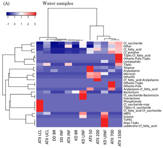 The Cf_saccharide gene cluster was the only SMGC detected in all the Red Sea sites. Selected SMGCs were unique to specific sample sites, namely, Cf_fatty_acid-Arylpolyene—was only detected in ATII 200, Otherks-Pufa and Otherks-T1pks were only detected in ATII 700, Otherks-Pufa-T1pks and T2pks-Cf_fatty_acid were only detected in ATII 1500, Cf_fatty_acid-Cf_saccharide and Cf_saccharide-nrps and Phosphonate and T3pks-cf_saccharide were only detected in ATII LCL, Cf_saccharide-Bacteriocin and Hserlactone were only detected in KD LINF and Ladderane-Cf_fatty_acid and Nrps-T1pks and T1PKS were only detected in KD brine–seawater Upper Interface (KD UINF). Additionally, among the non-Red-Sea dataset, Pufa (polyunsaturated fatty acid cluster) was unique to Guaymas Basin deep-sea hydrothermal vent plume water sample (GB VNT), thiopeptide cluster was only detected in Kueishantao shallow-sea hydrothermal vent area water sample KSW VNT and acyl_amino_acids (N-acyl amino acid cluster) was only detected in Loki’s Castle deep-sea vent black smoker chimney microbial mat sample (LC MM) (Table 2, Tables S2 and S3).