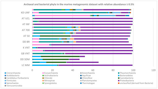 Archaeal and bacterial phyla detected in the marine metagenomic dataset. The relative abundancies (represented as % of total detected phyla) detected by MG-RAST are presented. The phylum is represented if its relative abundance is ≥ 0.5% in at least one of the assemblies.
