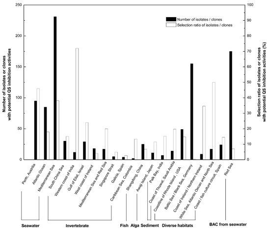 Screening from various marine environments using either biosensor strains or metagenomic sequencing showed abundance of QS-inhibitory marine bacteria (Figure 1) [30,31,32,33,34,35,36,37,38,39,40,41,42,43,44,45,46,47,48,49]. It could be seen that QS-inhibitory marine bacteria were mainly screened out from sea waters, marine sediments, as well as marine invertebrates, fish, algae, etc. These origins scattered in different regions and cities in the world.