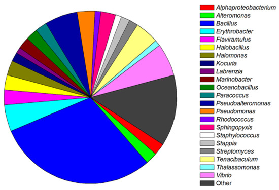Classification and relative abundance of the marine bacteria isolates with potential QS inhibition activities. The genera represented by a single isolate are grouped as “other”.