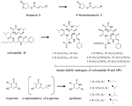 Structural modification of QSIs from marine bacteria was rarely mentioned only until recent years. Choi et al. has synthesized honaucin A (a natural QS inhibitor isolated from a marine cyanobacterium) and several derivatives using the fragment-based drug design strategy. The derivatives were designed based on alcohol unit, acid unit, and the whole structure of honaucin A. Evaluation proved that halogen substitution could effectively enhance the QS-inhibitory activity, which was dozens of times higher than that of honaucin A. Among the 23 candidates, 4′-bromohonaucin A seemed to be the most promising QSI [74]. Hansen et al. designed a series of lactam hybrid analogs of solonamide B (from marine Photobacterium halotolerans) and AIPs, such as S. aureus AgrC QSIs. The structural modification targeted expansion of ring size, type of side chain, amino acid substitutions and stereochemistry. The key factors in structures necessary for QS-inhibitory activity include the presence of a short fatty acid tail, the optimal tail length, all-D stereochemistry, Phe residue in the 2-position and Leu in 5-position, etc. Out of 27 analogs, five most efficient were screened out, the QS-inhibitory activities of which were also dozens of times higher than the compound before structural optimization [85]. Kwan et al. also compared the QS-inhibitory activity of lyngbyoic acid (from a marine cyanobacterium) with its structural related compounds. It was indicated that the fused cyclopropane “tag” in lyngbyoic acid, the free acid moiety, and longer alkyl chains might be crucial for the QS-inhibitory function [69]. Du et al. isolated several α-pyrones (from a Streptomyces sp. derived from marine algae) without QS-inhibitory activities. However, several―α-pyridones (pyridin-2(1H)-ones) obtained by the diversity enhanced extract method―showed QS-inhibitory activities [86]. This indicated that marine-derived natural compounds could also be considered as precursors of potential QSIs. The structures of above mentioned natural QSIs and their most promising derivatives were summarized in Figure 3.