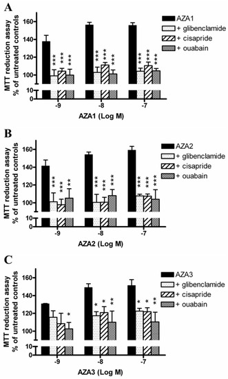To further investigate the role of K+ on AZAs-increased mitochondrial dehydrogenase activity, the experiments were carried out exposing IHH cells to the toxins in the presence of selective inhibitors of K+ transporters that are expressed in hepatocytes. In particular, the cells were pre-exposed for 1 h to 100 µM glibenclamide (inhibitor of KATP channel), 5 µM cisapride (inhibitor of hERG channel), or 10 µM ouabain (inhibitor of Na+/K+-ATPase), followed by 24 h exposure to each AZA (1 × 10−9–1 × 10−7 M). Subsequently, mitochondrial dehydrogenases activity was evaluated by the MTT reduction assay (Figure 5). The results are expressed as % of mitochondrial dehydrogenase activity in comparison to that recorded in the corresponding control cells that were exposed to each inhibitor, but not to the toxins. In general, all of the inhibitors significantly reduced the effects of AZAs to a similar extent, starting from the concentration of 1 × 10−9 M for all of the toxins. In particular, the mitochondrial dehydrogenases activity increased by the highest AZAs concentration (1 × 10−7 M) was reduced by glibenclamide, cisapride, and ouabain at levels that were comparable to those of the control cells, not exposed to the toxins: 104, 110, and 105%, respectively, for AZA1 (p < 0.001); 108, 107, and 104%, respectively, for AZA2 (p < 0.001); and, 122, 122, and 110%, respectively, for AZA3 (p < 0.05).