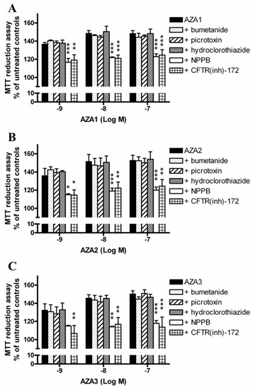 Role of Cl− transporters on AZAs effect at the mitochondrial level. The IHH cells were exposed for 1 h to 100 µM NPPB (unspecific inhibitor of Cl− channels), 5 µM CFTR(inh)-172 (inhibitor of CFTR), 100 µM picrotoxin (inhibitor of GABAA), 200 µM bumetanide (inhibitor of NKCC), or 100 µM hydrochlorothiazide (inhibitor of NCC), followed by for 24 h exposure to AZA1 (A), -2 (B), or -3 (C), and the effects evaluated by the MTT assay. The results are expressed as % of mitochondrial activity with respect to the untreated controls (with AZAs) and to untreated controls that were exposed to the specific inhibitor (with AZAs and inhibitors). Data are the means ± SE of five independent experiments performed in triplicate and they are reported as % of untreated control. Statistical differences: *, p < 0.05; **, p < 0.01; ***, p < 0.001 (two-way ANOVA and Bonferroni’s post test).