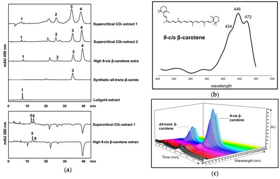 (a) HPLC chromatograms of ethanol extracts of carotenoids at 450 nm and 280 nm showing the carotenoid profiles. The major peaks shown are: 1, lutein; 2, α-carotene; 3, all-trans-β-carotene; 4, 9-cis-β-carotene; 5, 15-cis-phytoene; 6, all-trans-phytoene; mAU, milli-Absorbance Units. (b) UV-Visible spectrum of 9-cis-β-carotene; (c) 3D image showing spectral features and relative retention times for all-trans-β-carotene and 9-cis-β-carotene after HPLC chromatography.