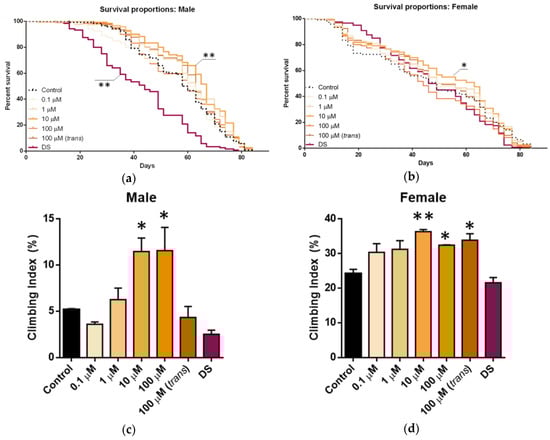 Treatments that improve lifespan are often associated with functional improvements. When seven-week-old, the same groups as above that were examined for lifespan were tested for mobility by assessing negative geotaxis following one week of supplementation. Figure 2c,d shows the locomotor function at 8 weeks of age for the different treatment groups and for both sexes. As with lifespan, the impact of the extract was greater in males than in females, but in both sexes, the solution applied at 10 µM with respect to total β-carotene was the most effective dose at improving the climbing ability, although, in males, this was matched by the 100 µM solution. Again, as with lifespan, the un-extracted D. salina had a significant negative impact on males but not on females when compared with the controls. A similar observation of negative effects using whole algal biomass was reported by Ross and Dominy [], who showed that whilst biomass supplements prepared from washed and dried Spirulina platensis had a deleterious effect on the growth of chicks fed 10 and 20% algae as part of their diet, Spirulina biomass up to 12% could substitute for other protein sources in broiler diets and would mediate good growth and feed efficiency.
