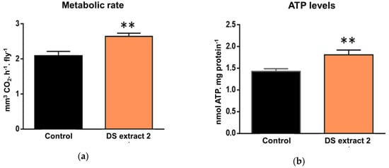 These combined results identified algal extracts with 10 µM total carotene as the most effective concentration for improved lifespan and mobility. Hence, we treated male flies, in which the effects were more marked, to assess the impact of natural carotenoid supplementation upon mitochondria (Figure 3). This time, we used a D. salina extract (DS Extract 2) which contained a greater concentration of 9-cis-β-carotene relative to all-trans-β-carotene and set the concentration of all-trans-β-carotene to match that used in the previous experiment. Whole-body metabolic rate was measured via CO2 production, and total body ATP levels were also measured. Whole metabolic rate is used as a surrogate marker for mitochondrial respiration. In treated flies, the metabolic rate increased by 27% (Figure 3a), and ATP levels increased by 26.5% compared with the control group (Figure 3b). Consequently, these data are consistent with natural β-carotene extracts from D. salina enriched in 9-cis-β-carotene improving mitochondrial function.