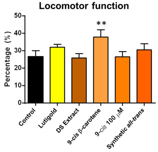 Fourteen-day supplementation in aged flies with different carotenoids from D. salina, DS Extract (6.71 µM all-trans-β-carotene and 8.94 µM 9-cis-β-carotene), 9-cis-β-carotene (5.59 µM all-trans-β-carotene and 13.22 µM 9-cis-β-carotene); Lutigold (0.07 µM lutein) and synthetic all-trans-β-carotene (5.59 µM all-trans-β-carotene). Effects on locomotor function assessed by negative geotaxis after administration of different carotenoids supplements. Only flies in the group treated with high concentration of 9-cis-β-carotene significantly improved their climbing index by 36.8%. All other groups had climbing indexes similar to that of the control group; n = 60 flies per group. Results are mean +SEM. ** p < 0.01.