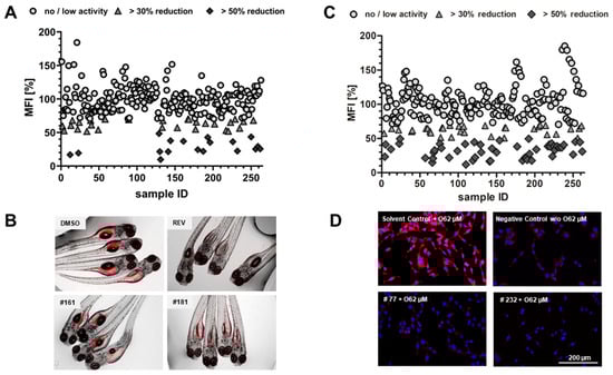 Bioactivity screening using the zebrafish Nile red fat metabolism assay and the anti-steatosis assay in HepG2 cells. (A) Data are presented as mean fluorescence intensity (MFI) relative to the solvent control. Zebrafish at 3 days post fertilization (DPF) were exposed for 48 h to 10 µg mL−1 cyanobacterial fractions and lipids around the yolk sac and intestine were stained with Nile red. (B) Representative images of zebrafish larvae (overlay of brightfield picture and red fluorescence channel). Solvent control, 0.1% dimethyl sulfoxide (DMSO); positive control, 50 µM REV and exposure to fraction #161 and #180. (C) Data are presented as MFI relative to solvent control (0.5% DMSO + O62 µM). HepG2 cells were exposed for 6 h to 62 µM sodium oleate (O62 µM) and 10 µg mL−1 cyanobacterial fractions. Nile red fluorescence stains neutral lipid reservoirs (red) and Hoechst 33342 the nucleus (blue). (D) Representative images of HepG2 cells (overlay of red and blue fluorescence channel). 0.5% DMSO + O62 µM; negative control, 0.5% DMSO; exposure to fraction #77 and #232.