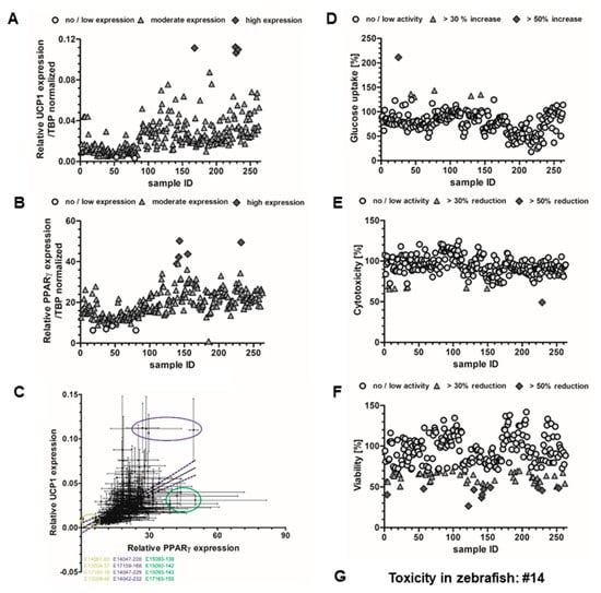 Analysis of mRNA expression of genes involved in (A) thermogenesis (uncoupling protein-1 (UCP-1)) and (B) adipocyte differentiation (PPARγ) by qPCR in brown adipocytes (n = 3). (C) Correlation between PPARγ and UCP-1 mRNA expression identifies three different groups (low UCP-1/low PPARγ; low UCP-1/high PPARγ; high UCP-1/high PPARγ). Values are shown as mean ± SEM. (D) Glucose uptake assay using 2-(N-(7-Nitrobenz-2-oxa-1,3-diazol-4-yl)Amino)-2-Deoxyglucose (2-NBDG) in HepG2 cells. Cells were exposed for 2 h to 10 µg mL−1 cyanobacterial fractions. An increase in fluorescence signal indicates higher uptake of the glucose analog 2-NBDG. Data are shown as mean fluorescence increase relative to the solvent control, 0.5% DMSO. (E) Cytotoxicity analysis by MTT from HepG2 cells following the glucose uptake assay. Data are presented relative to the solvent control, 0.5% DMSO. (F) Cytotoxicity of cyanobacterial fractions on HepG2 cells following the anti-steatosis screening assay. Data are presented in percentage relative to the solvent control (0.5% DMSO) + O62 µM. (G) The fraction 14 was the only to induce general toxicity in the zebrafish assay at 10 µg mL−1 (100% of mortality after 24/48 h of exposure).