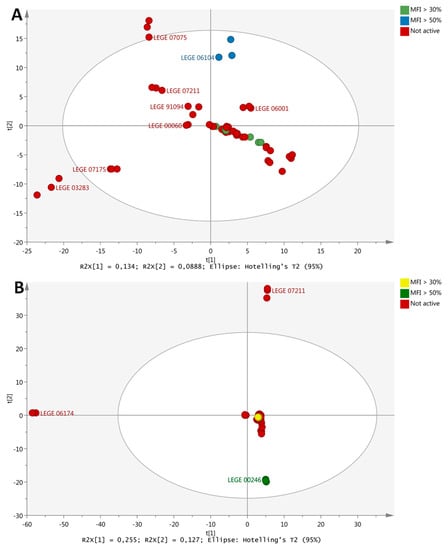 Matching of metabolite profiling with bioactivities for the selection of most promising cyanobacterial fractions. (A) PCA scores plot of E fractions colored according to anti-steatosis bioassay in HepG2 cells. Bioactivity is indicated as percentage MFI, mean fluorescence intensity. Strain names are indicated on the plot (e.g., LEGE07211). (B) PCA scores plot of G fractions colored according to activity in the zebrafish Nile red fat metabolism assay. The analysis was based on 1002 and 1228 collected markers on fraction E and G, respectively. The fractions were prepared in triplicate, and each replicate was run in triplicate.