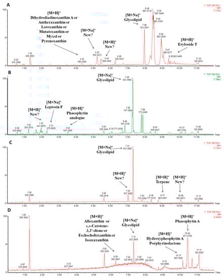 The identification of known and unknown compounds for one fraction of each bioactivity is represented in Figure 4, and the remaining chemical characterizations of promising fractions are shown in the Supplementary Tables S3–S6. By database searches in MarinLit [15], ChemSpider [16] and SciFinder [17], several known and unknown metabolites were identified, and the exact masses of the mass peaks compared to those available in the databases. For example, in Figure 4A, the search in databases resulted in the identification of eryloside T and a xanthin compound amongst several unidentified mass peaks in the fraction LEGE07173B with lipid reducing activity in zebrafish. In Figure 4B, the characterization of mass peaks identified leptosin F and a phaeophytin analogue in the fraction LEGE07167B with anti-steatosis activity.
